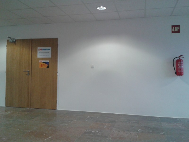 Postupně došlo k zazdění otvorů na schodištích, zazdění příchodu a osazení nových dveří u výtahů, posunům stěn na podestách včetně nových dveří (zvětšení plochy kanceláří na úkor podesty) a nakonec k vybourání stávající skleněné příčky kanceláří, osazené informačními nástěnkami. To všechno částečně nebo plně omezovalo provoz našich kanceláří.