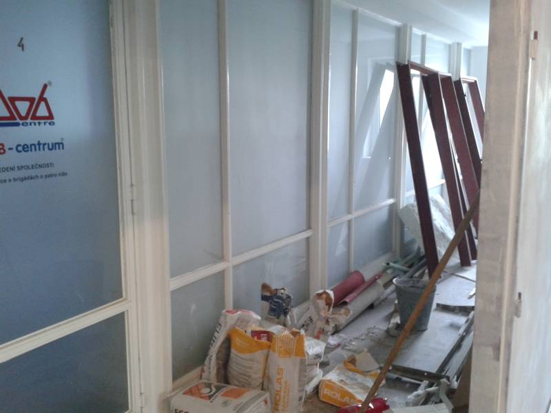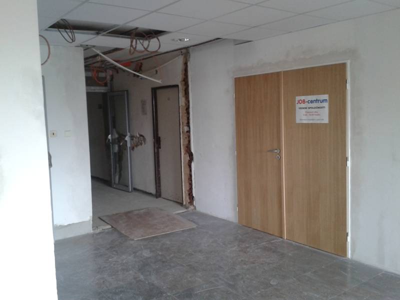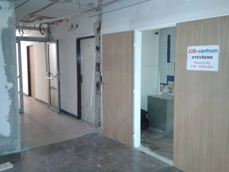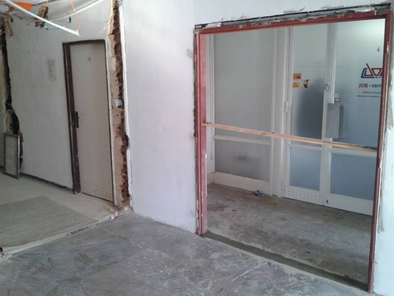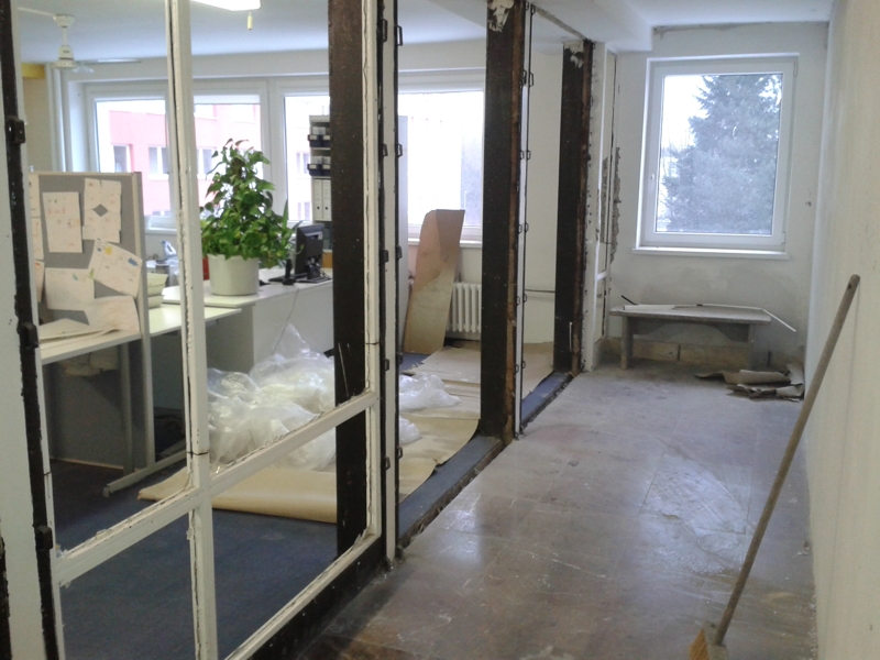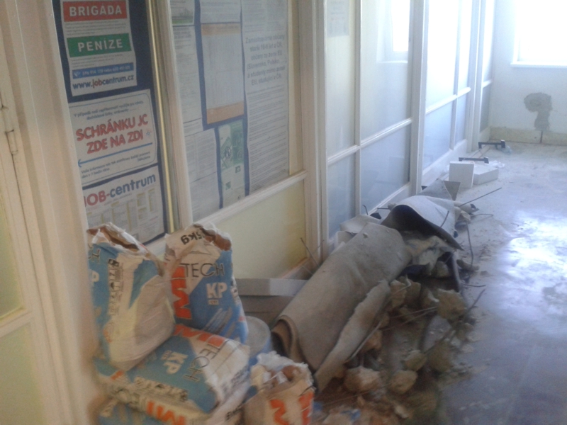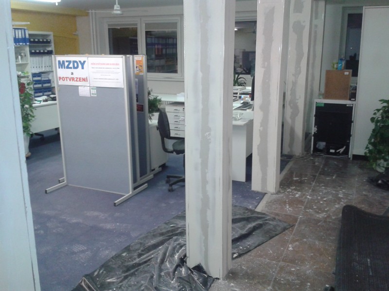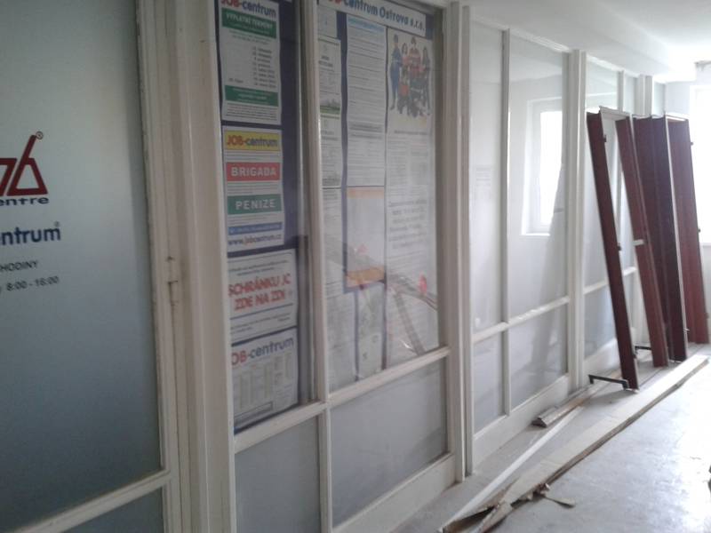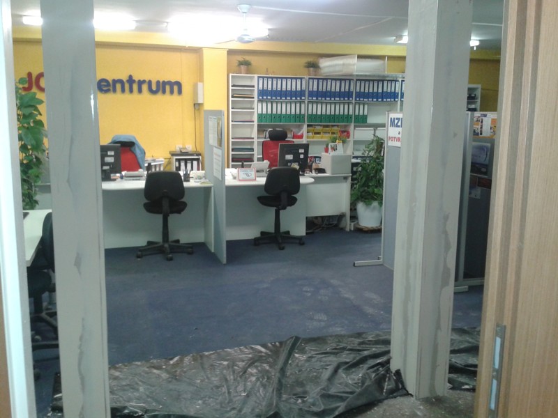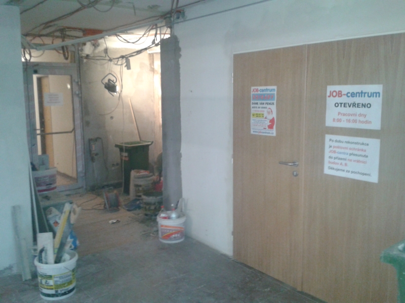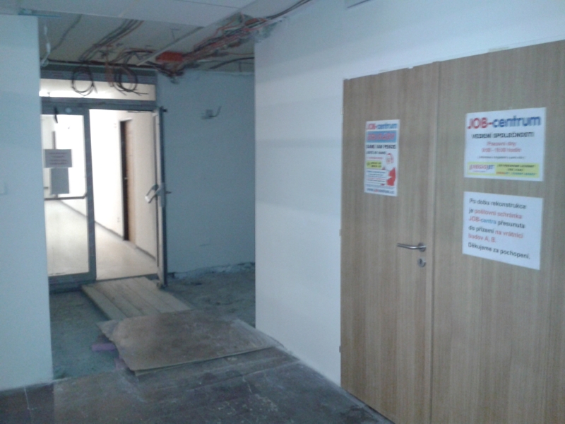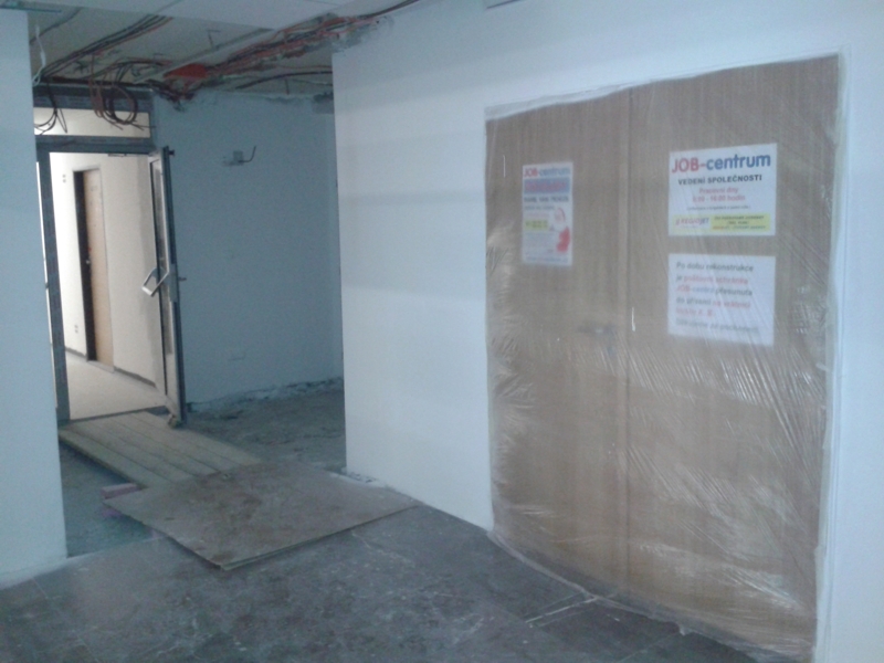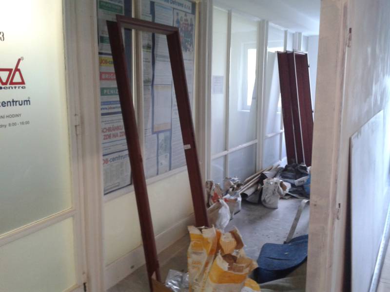 Budování nových požárních příček a dveří na přístupech do budovy A kanceláří JOB-centrum Ostrava červenec 2015 až září 2015, vzhledem kke špatné projektové dokumentaci a skluzům s vícepracemi TRVALO DO KONCE ÚNORA ROKU 2016.